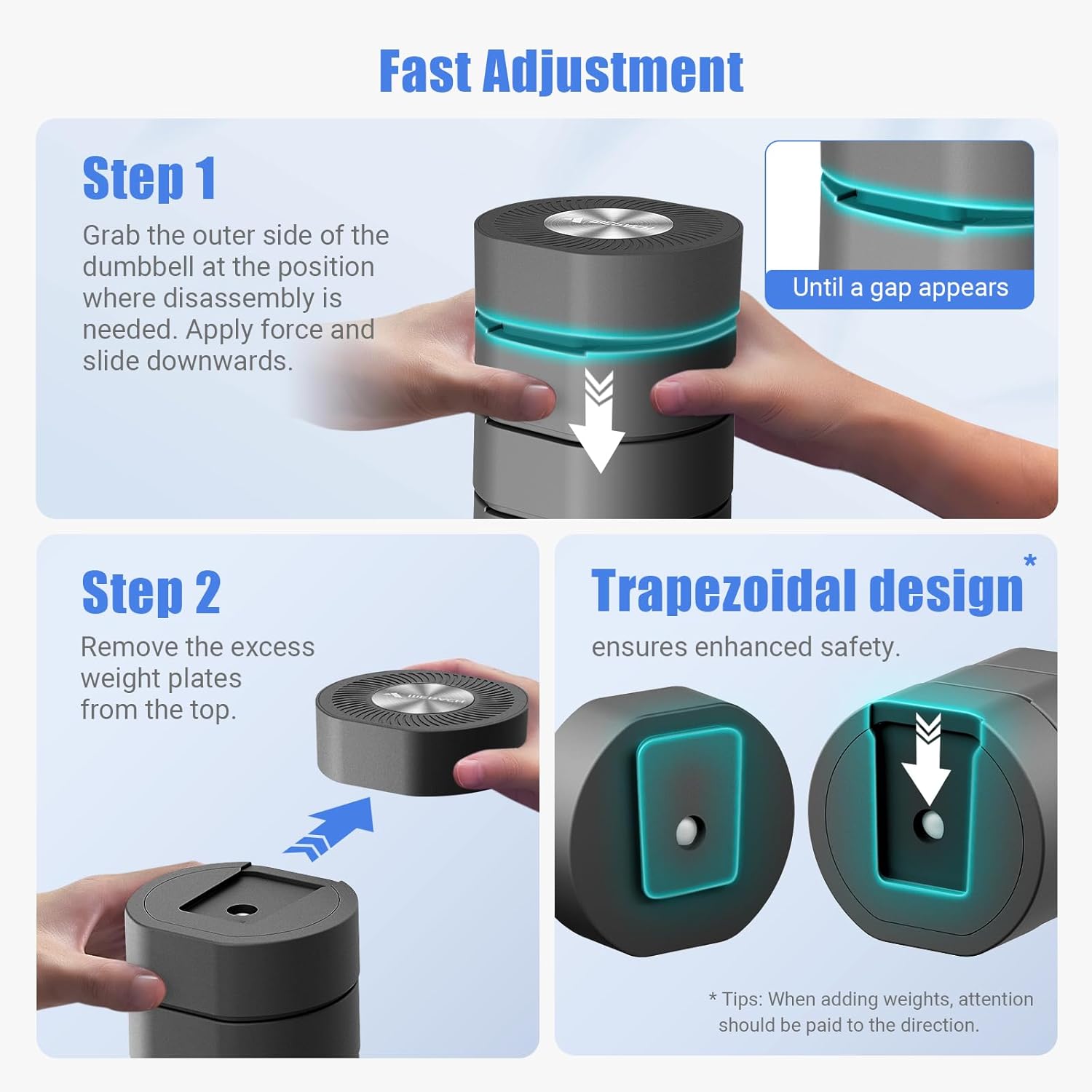 Safety is a priority when it comes to any fitness equipment. The upgraded V-shaped dovetail groove structure of the MERACH Dumbbell Set ensures that adjusting the weights is a breeze while preventing unwanted slips. You simply hold and press the second weight, making it easy to switch without any hassle.